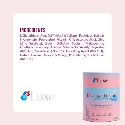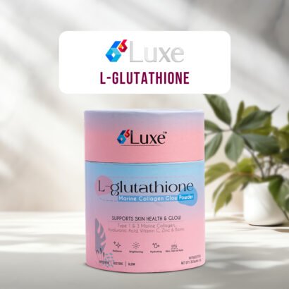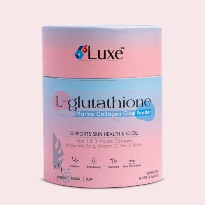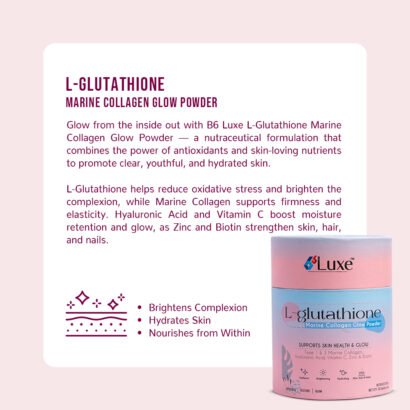 B6 Luxe L-Glutathione Marine Collagen Glow Powder is a premium skin-brightening and rejuvenating supplement enriched with L-Glutathione, Marine Collagen (Type I & III), Hyaluronic Acid, Vitamin C, Zinc and Biotin to support skin health, radiance, and hydration from within.