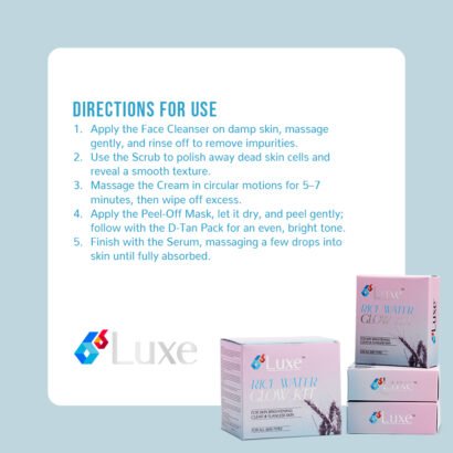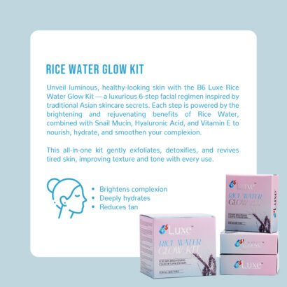 B6 Luxe Rice Water Glow Kit is a complete 6-step facial care system enriched with Rice Water, Snail Mucin, Hyaluronic Acid, and Licorice that deeply cleanses, brightens, and hydrates your skin for a radiant, glass-like glow.