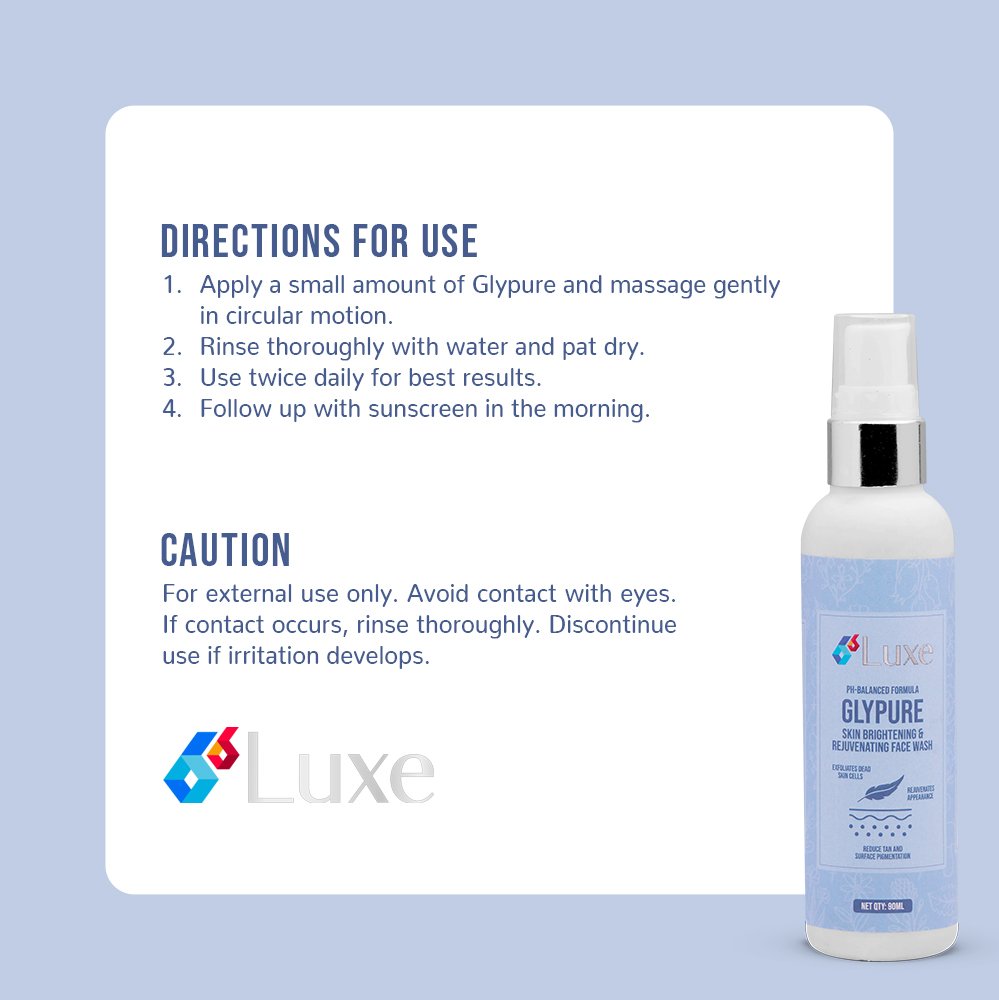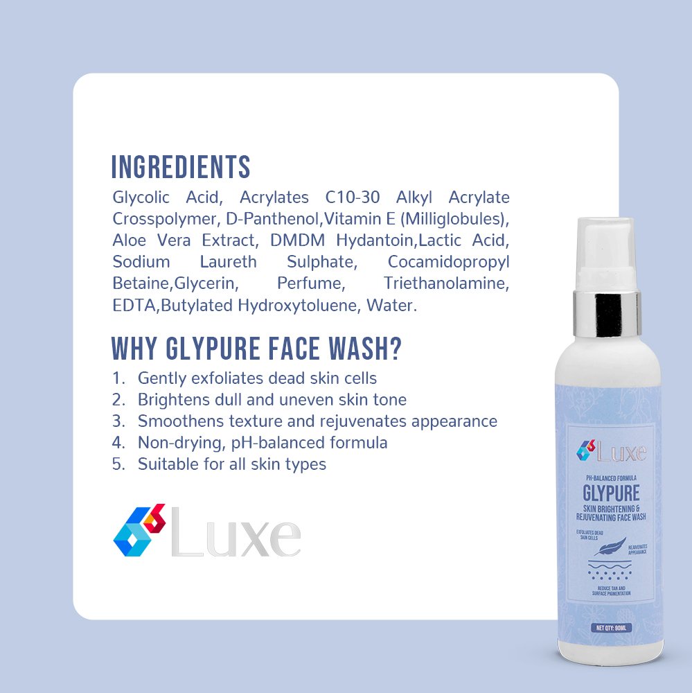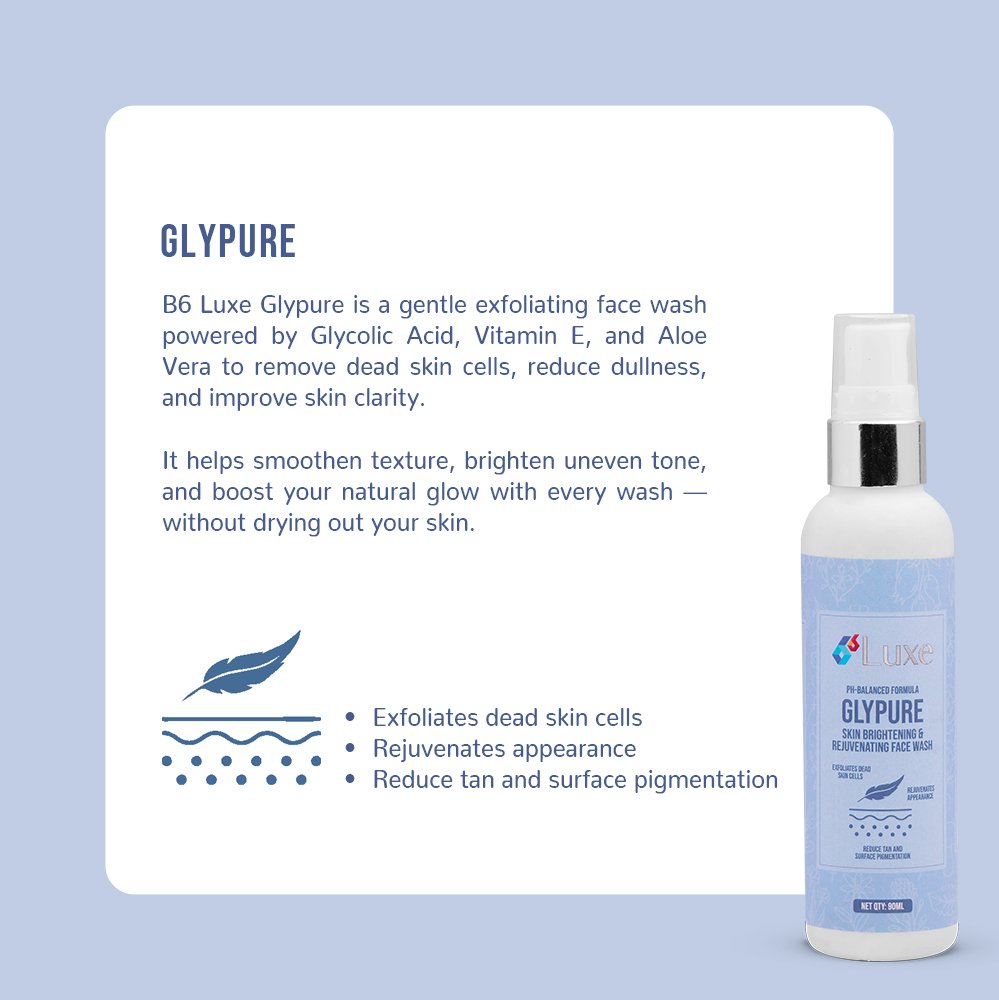 B6 Luxe Glypure Face Wash is a pH-balanced, skin-brightening cleanser that gently exfoliates dead skin cells, reduces tan and pigmentation, and rejuvenates dull skin for a visibly radiant glow.
