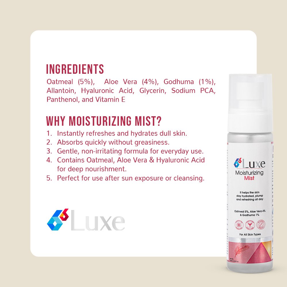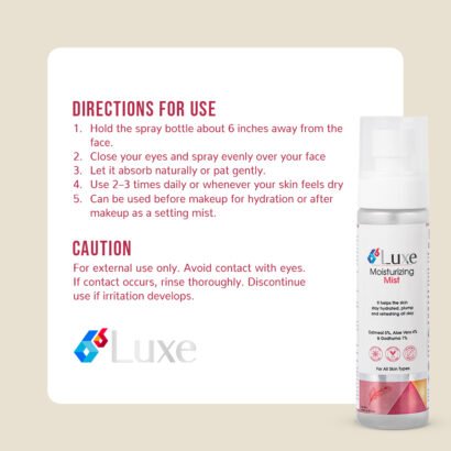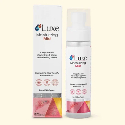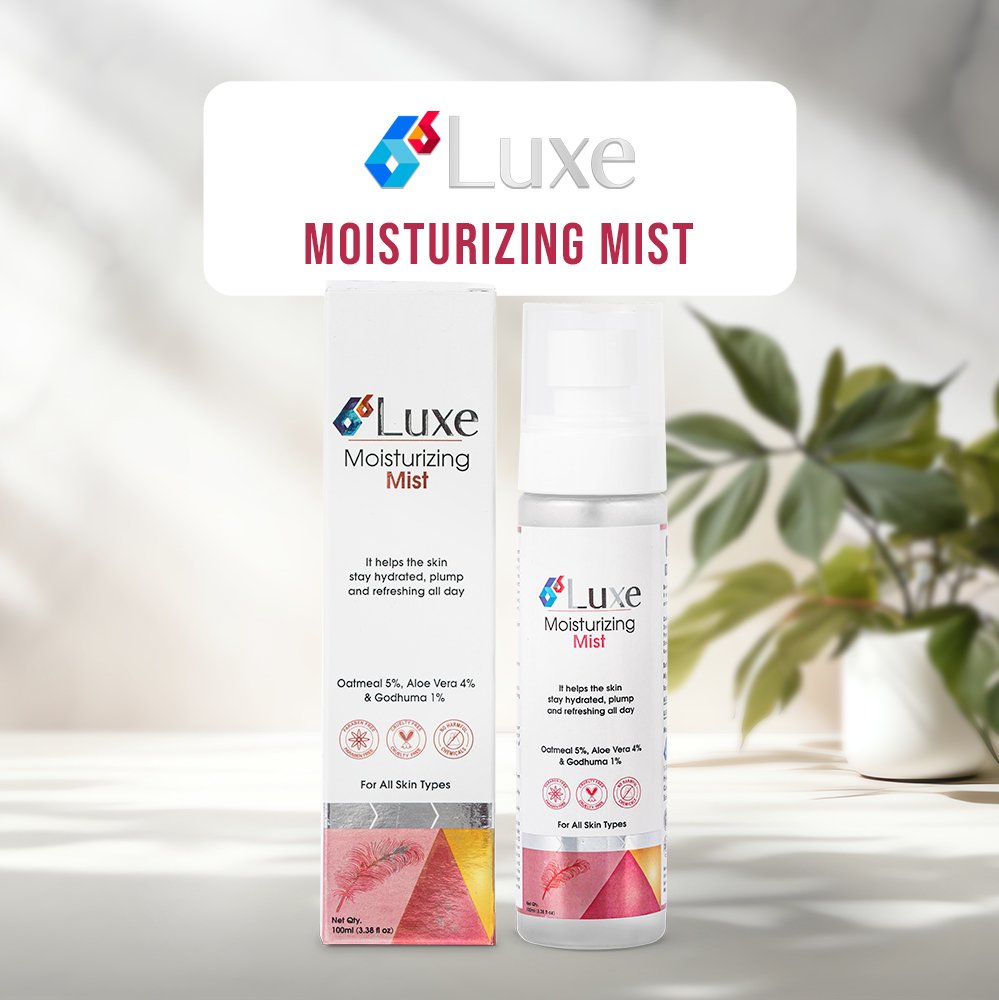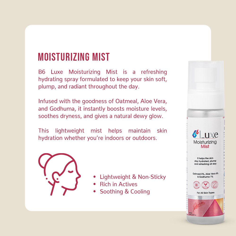 B6 Luxe Moisturizing Mist is a light, water-based mist that helps keep your skin hydrated, plump, and refreshed throughout the day. Enriched with Oatmeal, Aloe Vera, and Godhuma (Wheat extract), it’s designed for daily use on all skin types.