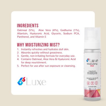 B6 Luxe Moisturizing Mist is a refreshing, lightweight face and body mist designed to help your skin stay hydrated, plump, and comfortable throughout the day. Enriched with Oatmeal (5%), Aloe Vera (4%), and Godhuma (1%), it supports the skin’s natural moisture balance without leaving a greasy or sticky feel. Ideal for all skin types, it can be used as part of your daily skincare routine or as a quick pick-me-up whenever your skin feels dull or dry.