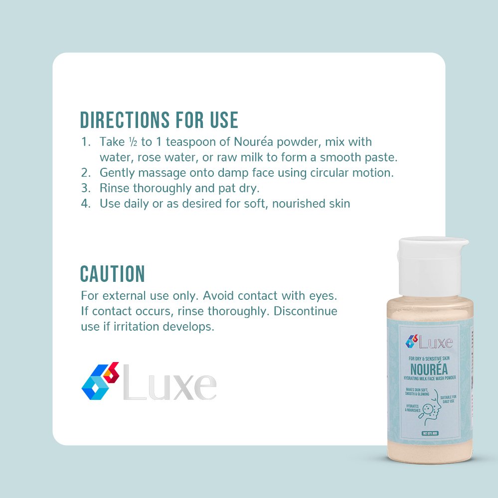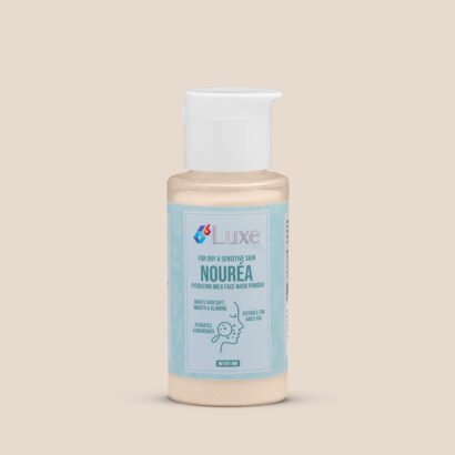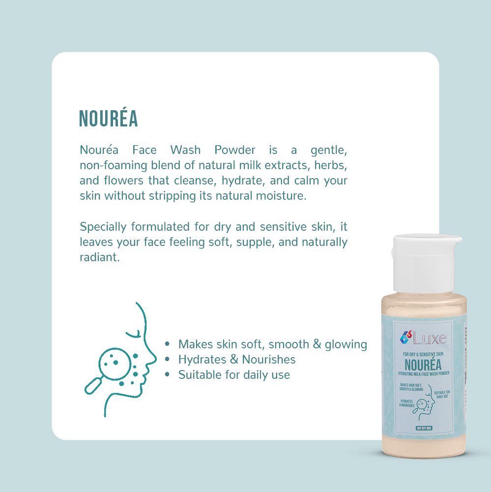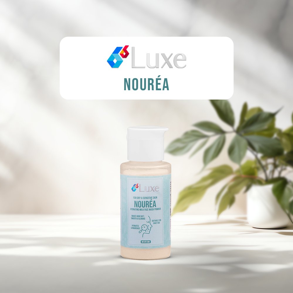 B6 Luxe Nouréa Hydrating Milk Face Wash Powder is a gentle, non-foaming cleanser infused with milk, herbs, and floral extracts that deeply hydrate, soothe, and soften dry and sensitive skin for a naturally glowing complexion.