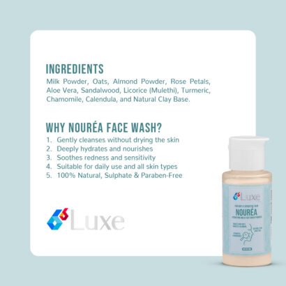 Experience the purity of natural cleansing with B6 Luxe Nouréa Face Wash Powder. Crafted with milk powder, oats, aloe vera, rose petals, sandalwood, and licorice, this delicate blend hydrates and nourishes your skin without stripping its natural oils.