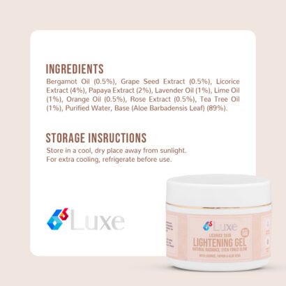 B6 Luxe Licorice Skin Lightening Gel is a gentle, alcohol-free gel that blends licorice, papaya, aloe vera, and botanical extracts to help reduce pigmentation, lighten dark spots, and promote an even-toned, radiant complexion. Lightweight and soothing, it hydrates your skin and restores its natural glow.